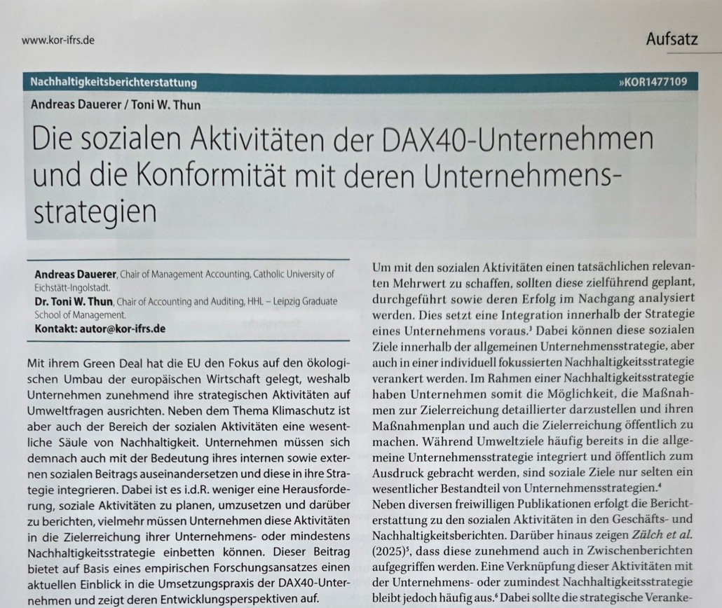 Mit ihrem Green Deal hat die EU den Fokus auf den ökologischen Umbau der europäischen Wirtschaft gelegt, weshalb Unternehmen zunehmend ihre strategischen Aktivitäten auf Umweltfragen ausrichten. Neben dem Thema Klimaschutz ist aber auch der Bereich der sozialen Aktivitäten eine wesentliche Säule von Nachhaltigkeit. Unternehmen müssen sich demnach auch mit der Bedeutung ihres internen sowie externen sozialen Beitrags auseinandersetzen und diese in ihre Strategie integrieren. Dabei ist es i.d.R. weniger eine Herausforderung, soziale Aktivitäten zu planen, umzusetzen und darüber zu berichten, vielmehr müssen Unternehmen diese Aktivitäten in die Zielerreichung ihrer Unternehmens- oder mindestens Nachhaltigkeitsstrategie einbetten können. Dieser Beitrag bietet auf Basis eines empirischen Forschungsansatzes einen aktuellen Einblick in die Umsetzungspraxis der DAX40-Unternehmen und zeigt deren Entwicklungsperspektiven auf.