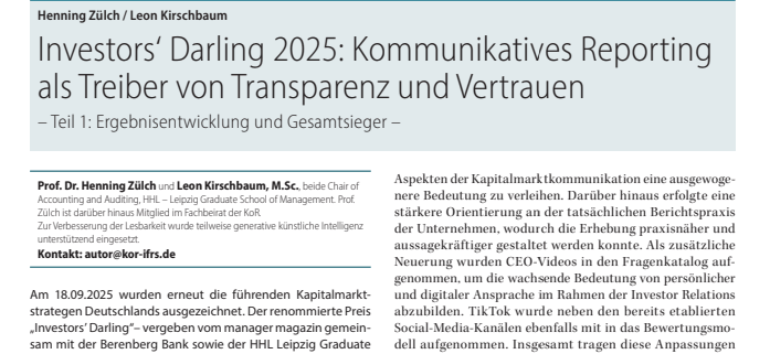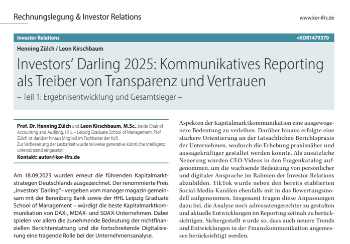 Am 18.09.2025 wurden erneut die führenden Kapitalmarktstrategen Deutschlands ausgezeichnet. Der renommierte Preis „Investors’ Darling“– vergeben vom manager magazin gemeinsam mit der Berenberg Bank sowie der HHL Leipzig Graduate School of Management – würdigt die beste Kapitalmarktkommunikation von DAX-, MDAX- und SDAX-Unternehmen. Dabei spielen vor allem die zunehmende Bedeutung der nichtfinanziellen Berichterstattung und die fortschreitende Digitalisierung eine tragende Rolle bei der Unternehmensanalyse.